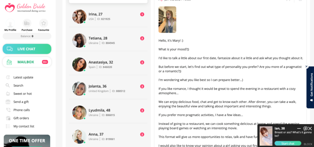 If you want to go private and establish a more intimate connection with the lady of your choice, you may go to the live chat. The bragging point of this feature is that you can turn your cameras on and enjoy face-to-face interaction. Therefore, you can get closer to your compatible partner in a matter of several chatting sessions. Also, you can use the mailbox to share text messages and media files with the GoldenBride members.
