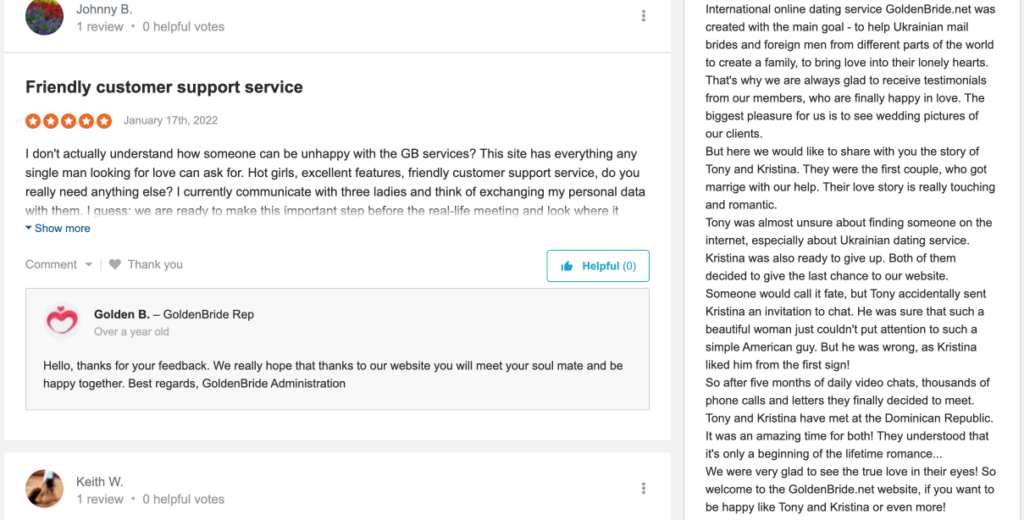 Other dating experts on social media platforms like Reddit also mention the GoldenBride dating website. They mention that it has good value for money and diverse services that promote a first-class dating experience.